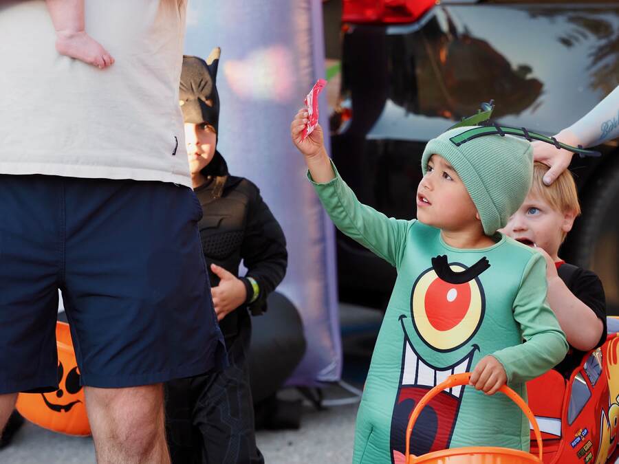 The event featured a variety of family-friendly activities, including a rock climbing wall, cotton candy, a face painting station, and yard games that kept the crowd entertained between candy stops.