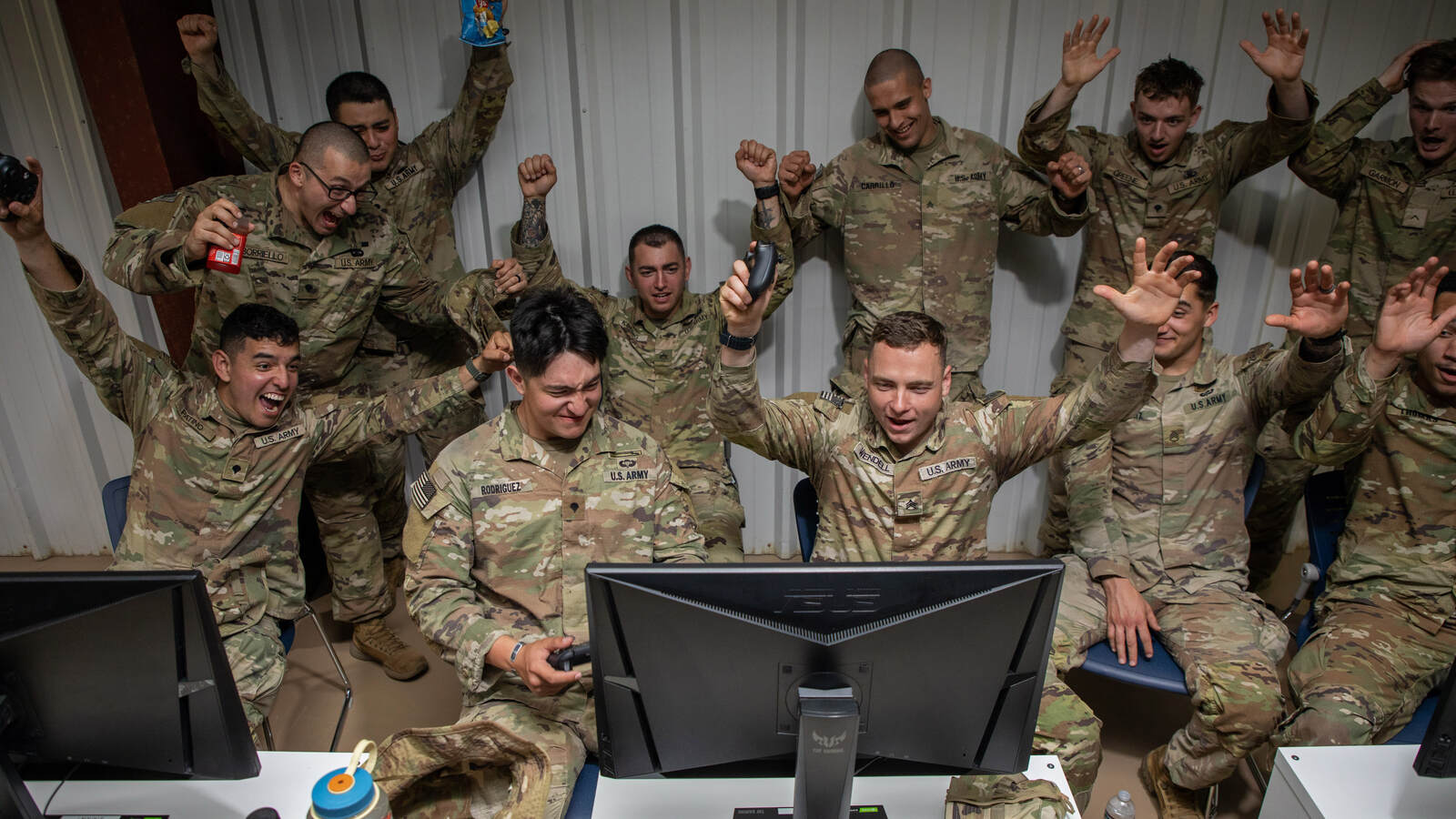 Soldiers with 2nd Battalion, 505th Parachute Infantry Regiment, 3rd Brigade Combat Team, 82nd Airborne Division, celebrate a touchdown pass while playing "EA Sports College Football 26" at the USO Fort Polk Grand Opening on March 3, 2026.