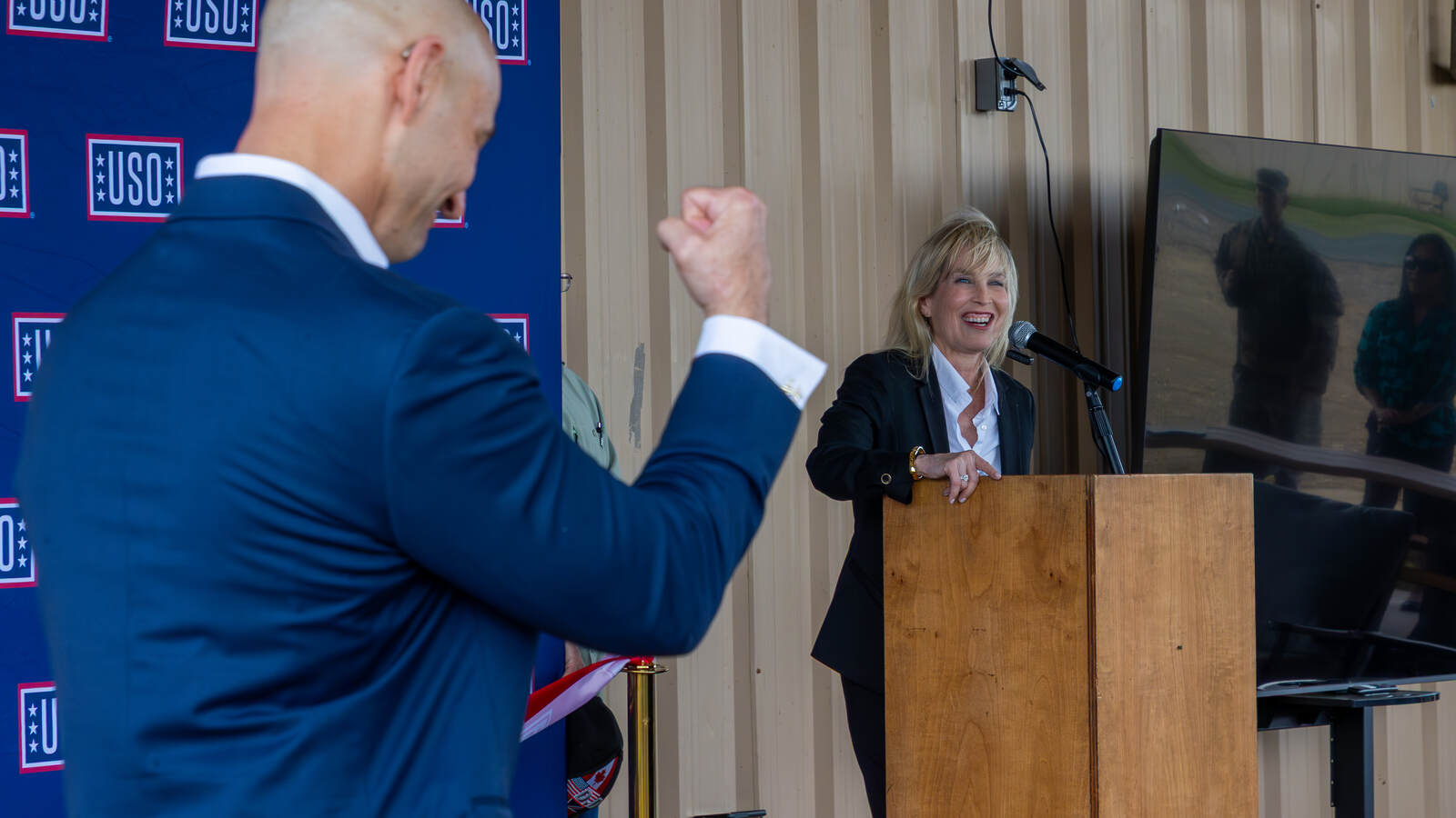 Jason Burkett, United Service Organizations executive director for Mississippi, Louisiana, and Florida, fist-pumps during a speech by Lisa Marie Riggins, USO regional president for the Southeast, at the new USO Center at Fort Polk, La., on March 3, 2026. (U.S. Army photo by Porsha Auzenne)